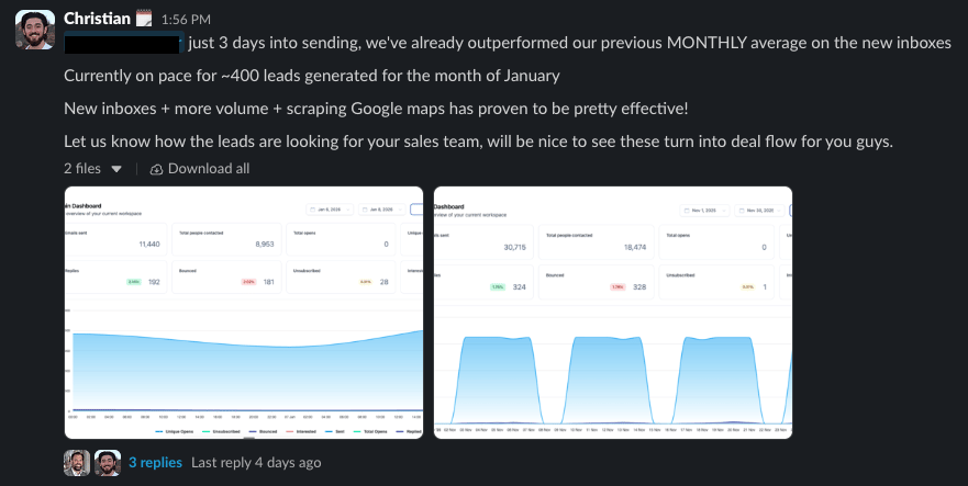 We recently scaled this client’s volume from 30k -> 120k emails/mo and generated 2X our previous MONTHLY lead volume in just 3 days of sending (~65 leads/mo -> 26 leads/day).