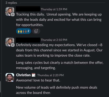 Not to mention as well, our client closed 8 deals from our previous sending volume since August of this year.